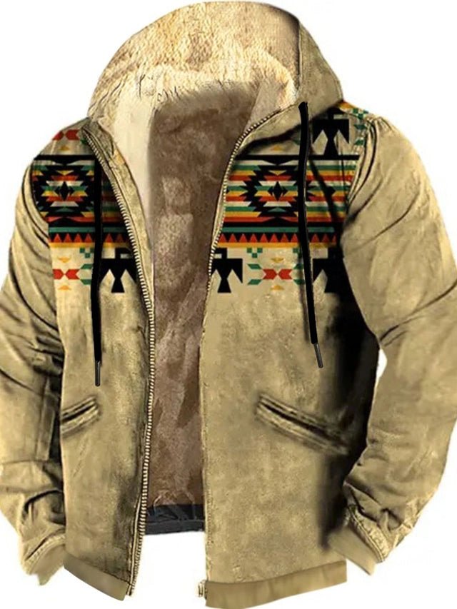 Omarm een gedurfde, kenmerkende stijl met deze etnische jas met capuchon en rits voor heren. Met ingewikkelde etnisch geïnspireerde patronen en een functionele ritssluiting combineert deze jas cultureel design met modern comfort, perfect voor casual uitjes of om een unieke draai aan je garderobe te geven.